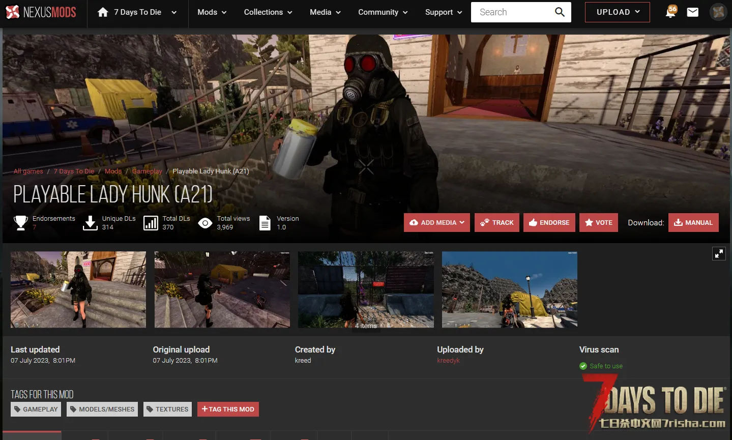 N网网址:Playable Lady Hunk (A21) at 7 Days to Die Nexus – Mods and community (nexusmods.com)