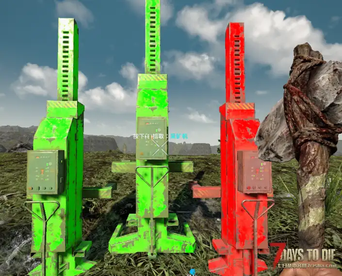 放置后可用斧头或钉枪更改是否可拾取状态,矿机是无敌的玩家打不坏,僵尸也打不坏,《绿色》为开采中的状态,《红色》则是可以收获的状态,产出时间可根据需求自行修改,直连MOD,服务器可用,玩家无需下载MOD,联机也可用,单机更可用。