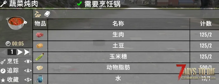肉类都只需要一份生肉,炖肉,蔬菜炖肉和牛排配土豆只需要两份生肉。