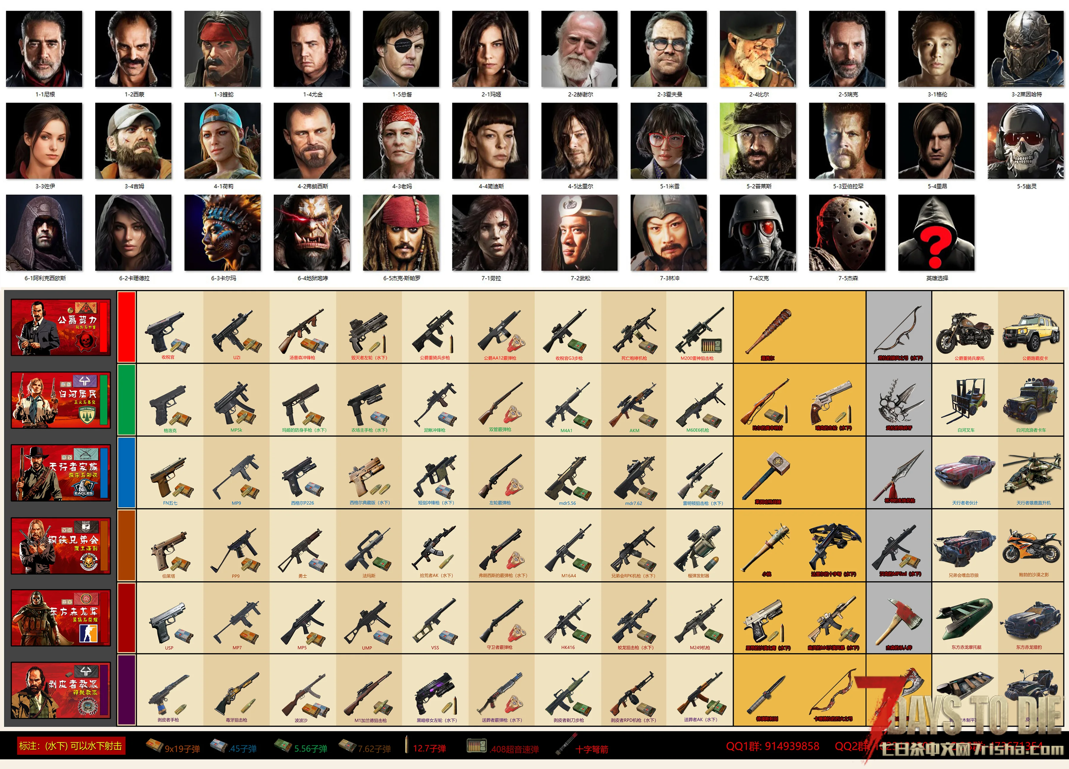 《六大家族枪械包》,所有枪械代码属性全是原版七日杀枪械修改的数据,只比原版属性高8~10%不会超模,但子弹制作材料增加(每发子弹的制作都要给公爵上税),这就平衡了。在末世枪械容易得到,但子弹才是稀缺资源!这很符合《行尸走肉》的设定。没有子弹的枪械还不如长矛有用!每个家族都有自己的英雄武器!制造条件也很苛刻,采用了《亡灵遗产》的枪械升级系统,一开始只能制作1级英雄枪械,后期可以慢慢升级成6级!子弹类型设计照搬了绝地求生(吃鸡),腰射手感更像 CS(反恐精英),部分模型套用了塔科夫,潘特武器,总之全缝在一起了。。。《六大家族武器包》属于免费赠送的自用MOD,禁止传播!