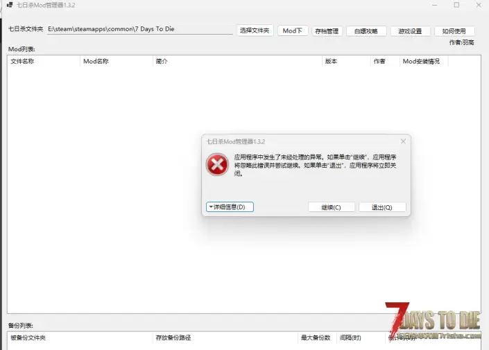 at 七日杀Mod管理器.Tool. RefreshModListView(ListView listView, String GamePath) in M:\demo\c#_demo\vs2019\七日杀mod管理器\七日杀Mod管理器\Tool.cs:line 504