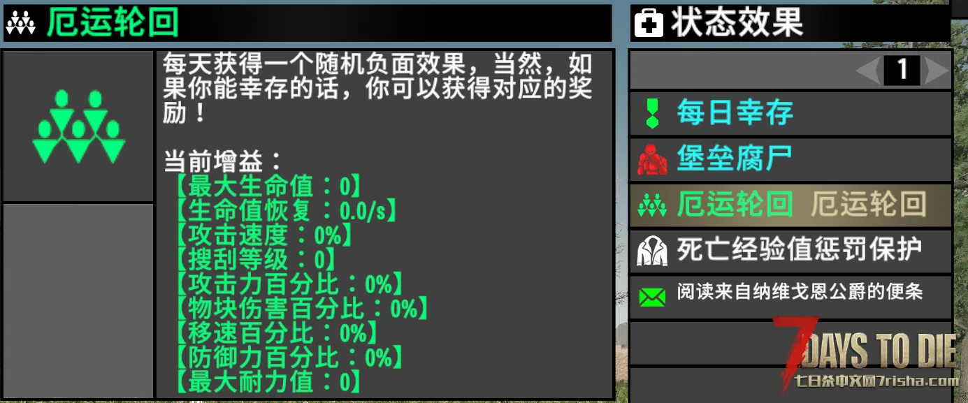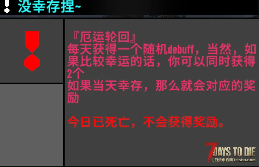 进入游戏时,玩家获得《厄运轮回》系列中的buff,每天凌晨0准时刷新,每天刷新1个或者2个debuff,刷新出2个debuff的概率为10%。并且每N个不同的debuff为一个轮回,简单来说就是每天一个/两个debuff并且不会重复。