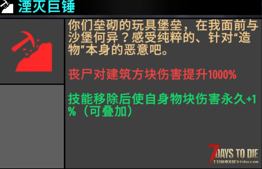 | 26 | 拆迁办の神 | “丧尸持有‘40米拆迁许可’,看墙拆墙,看门拆门!您的基地?不过是高级点的豆腐渣。” | 丧尸物块伤害+1000% |