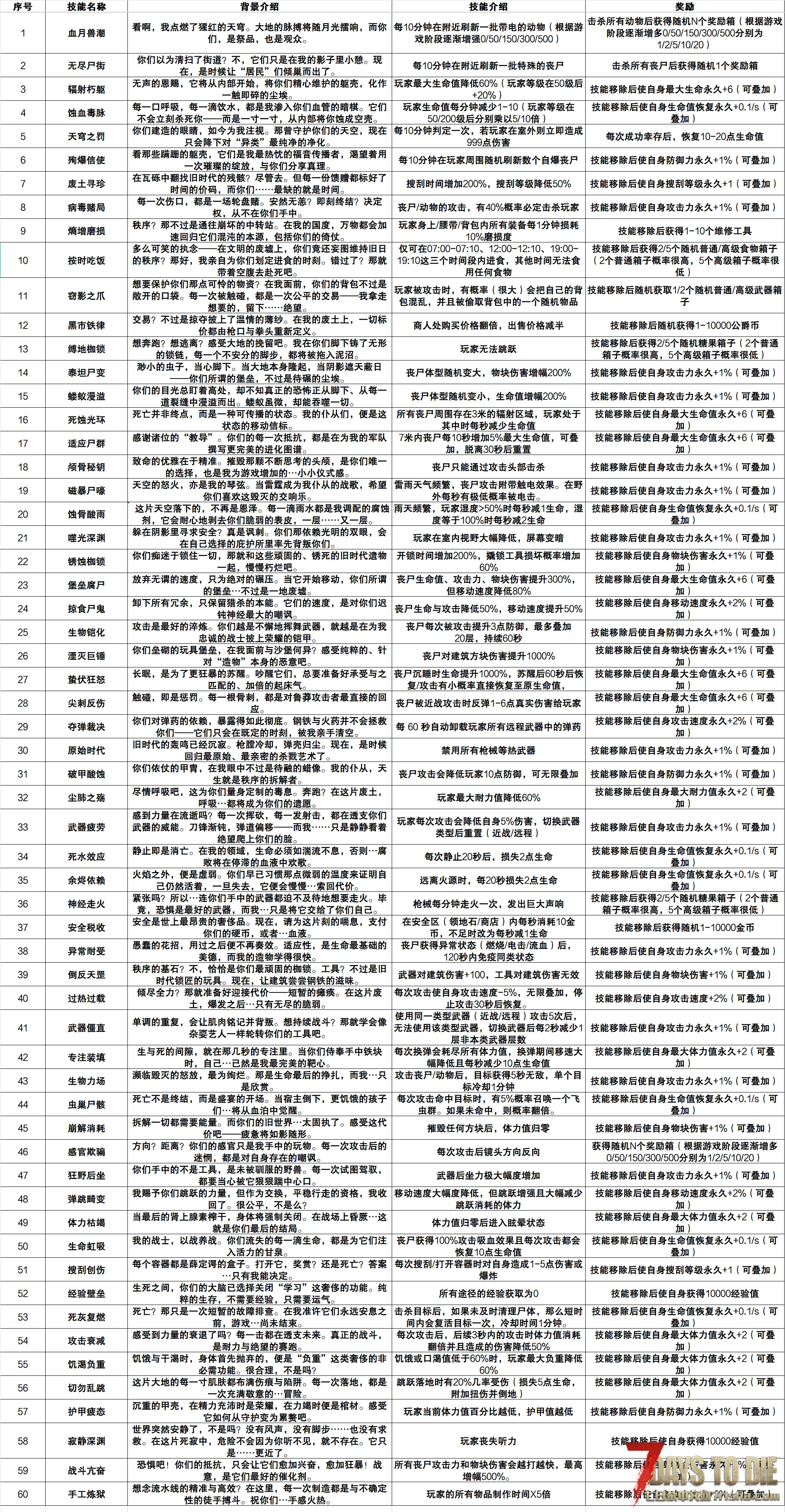 | 17 | 越打越嗨 | “丧尸观看《热血高校》后领悟:挨打就能变强!您打的越狠,它们血越厚,爱了爱了。” | 周围7米内丧尸的最大生命值每10秒+5%,无限叠加,远离该丧尸30秒后重置 |
