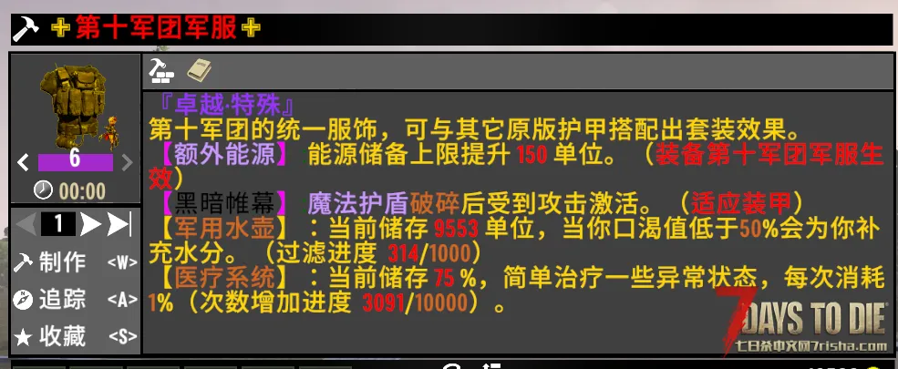 军用水壶和医疗系统必须装备第十军团军服才能启动,竖着的绿条代表能源充能,受到攻击会被打断,最右边的代表是对敌人的等级评定,一共17个等级,等级越高越危险,等级判定会有延迟(因为卡所以降低了频率)