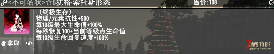 代价:自身耐力恢复-50%, 饥饿/口渴值每秒-1 持续20秒