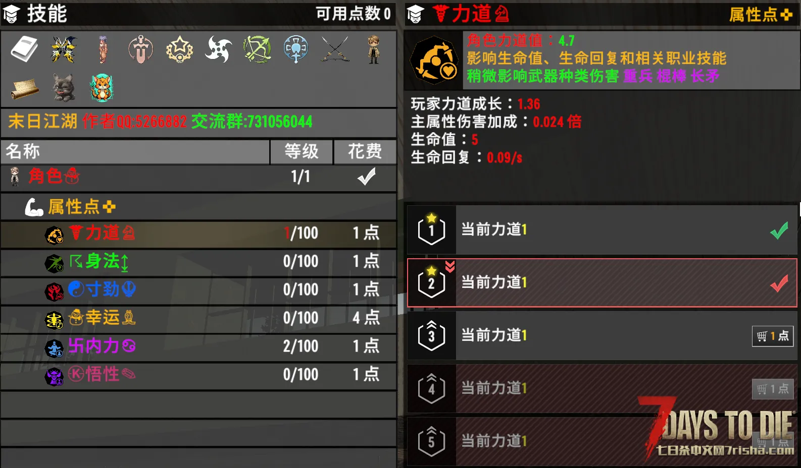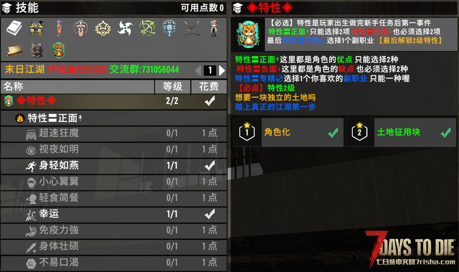 1-【角色特性化】初期角色完成新手任务,获得6点技能点,在特性技能栏下个性化角色能力。-注:这个模仿僵毁游戏。