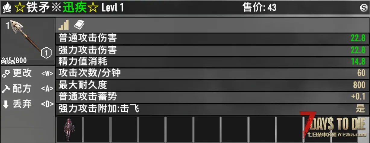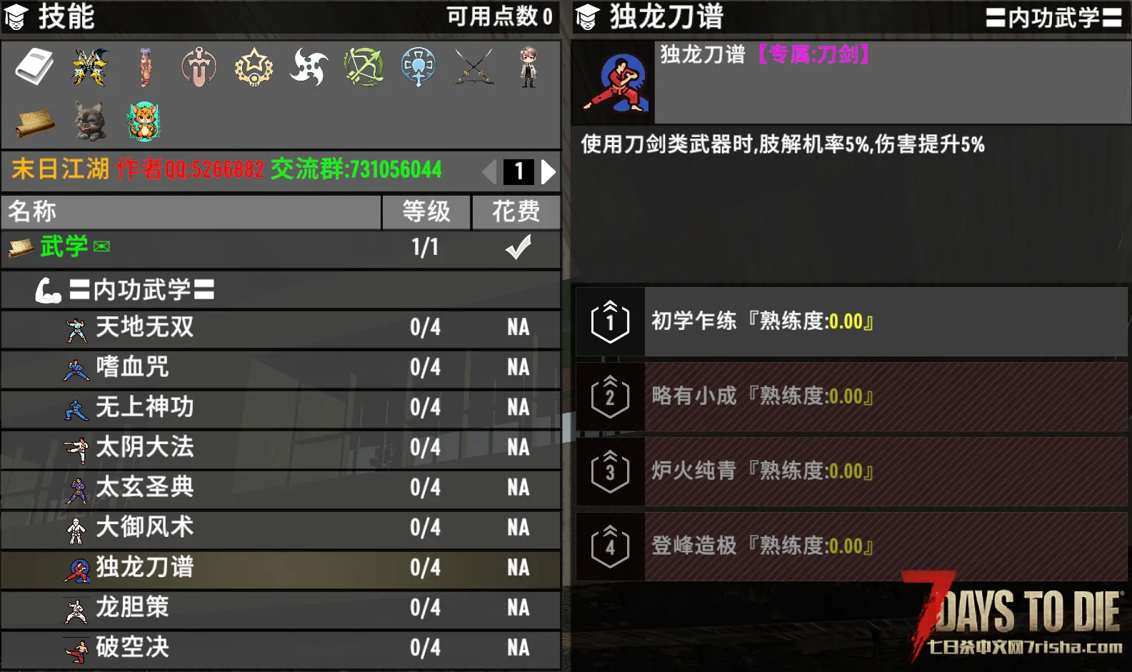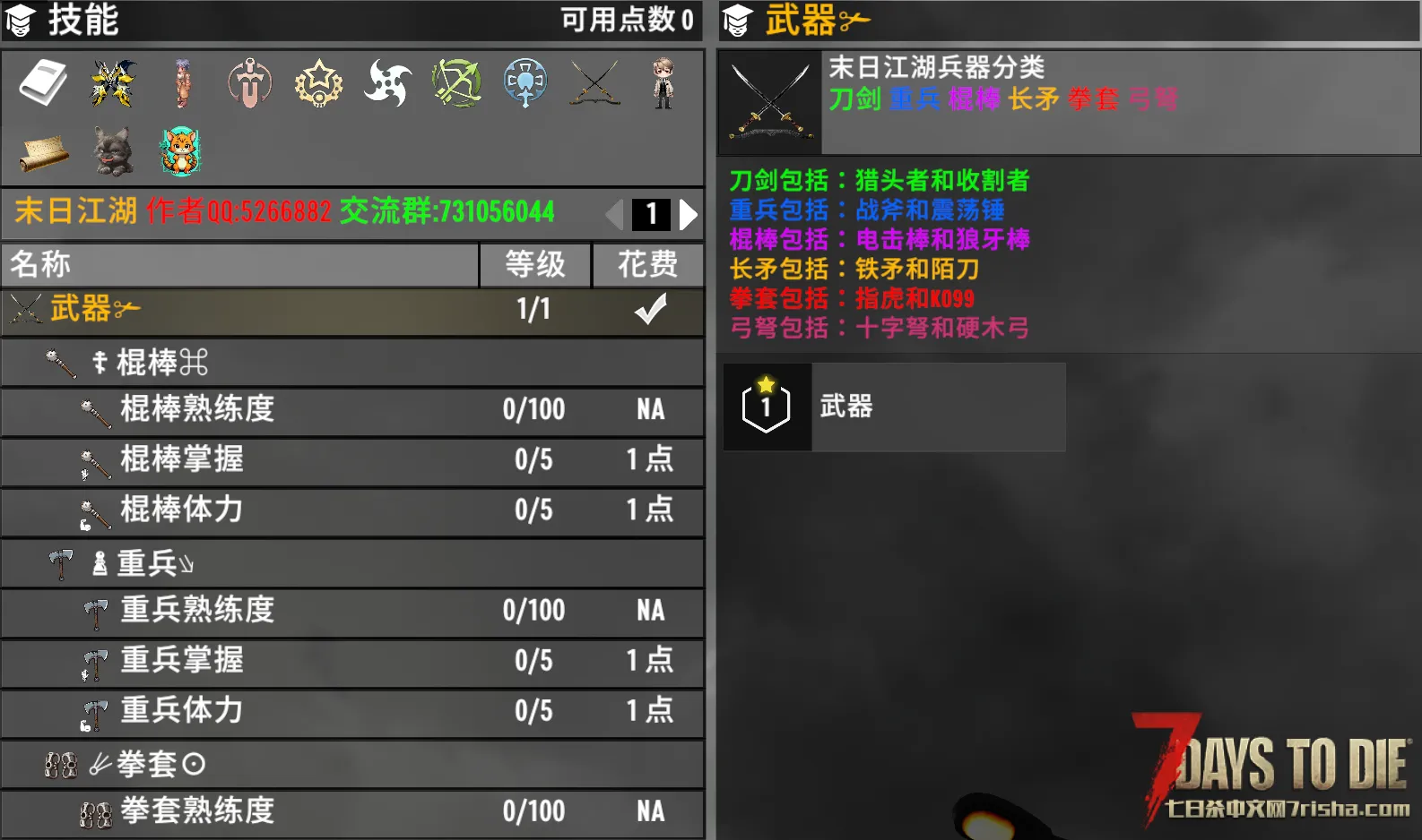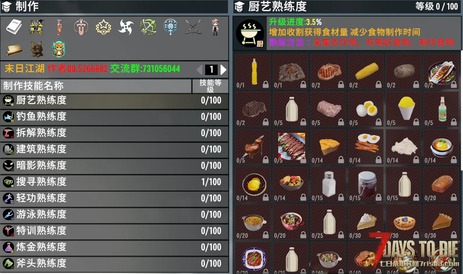 7-【生存熟练度】添加十四种熟练度:厨艺、钓鱼、拆解、建筑、暗影、搜寻、轻功、游泳、特训、炼金、斧头、镐子、铲子、暗器。影响各种能力和游戏的进度发展。