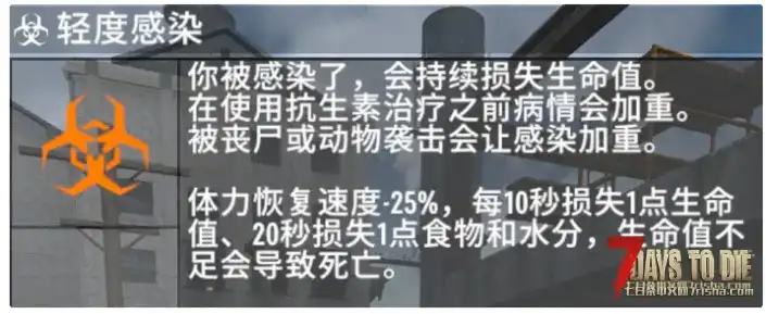 作者我提个想法,能否让死亡惩罚随机删除背包或快捷栏中的几件物品,复活后默认经验惩罚,食物口渴值减半,附加一个感染。中文网有相关感染增强mod,感染的buff效果如下图。这样能让人感受到死亡的恐怖,毕竟如果重要的武器与子弹随机没了,一定会很伤心,加上复活后的感染buff效果,让人忌惮死亡带来的各种负面影响,有种末日我要活着的感觉。