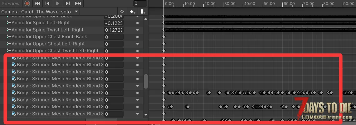 这里说一下表情的原理,其原理就是在controller对应的anim添加一段曲线,指定控制模型Body下的Skinned Mesh Renderer组件,控制相关的形态键在某一帧的权重:
