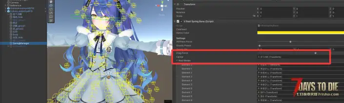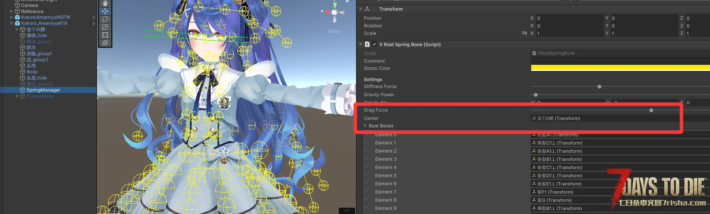 走路的时候动骨飘动很奇怪是因为没给VRoid SpringBone那个组件分配一个Center。你没分配的话弹簧骨骼的运动计算是基于世界坐标的,走路的时候人物坐标和世界坐标是分开的当然会让动骨乱飘(相当于是人物拖拽着动骨走)。你得给它分配一个Center(比如模型根骨骼之类的),这样在计算弹簧骨骼的运动时就会依据这个根骨骼来计算相对运动,就不会乱飘了。