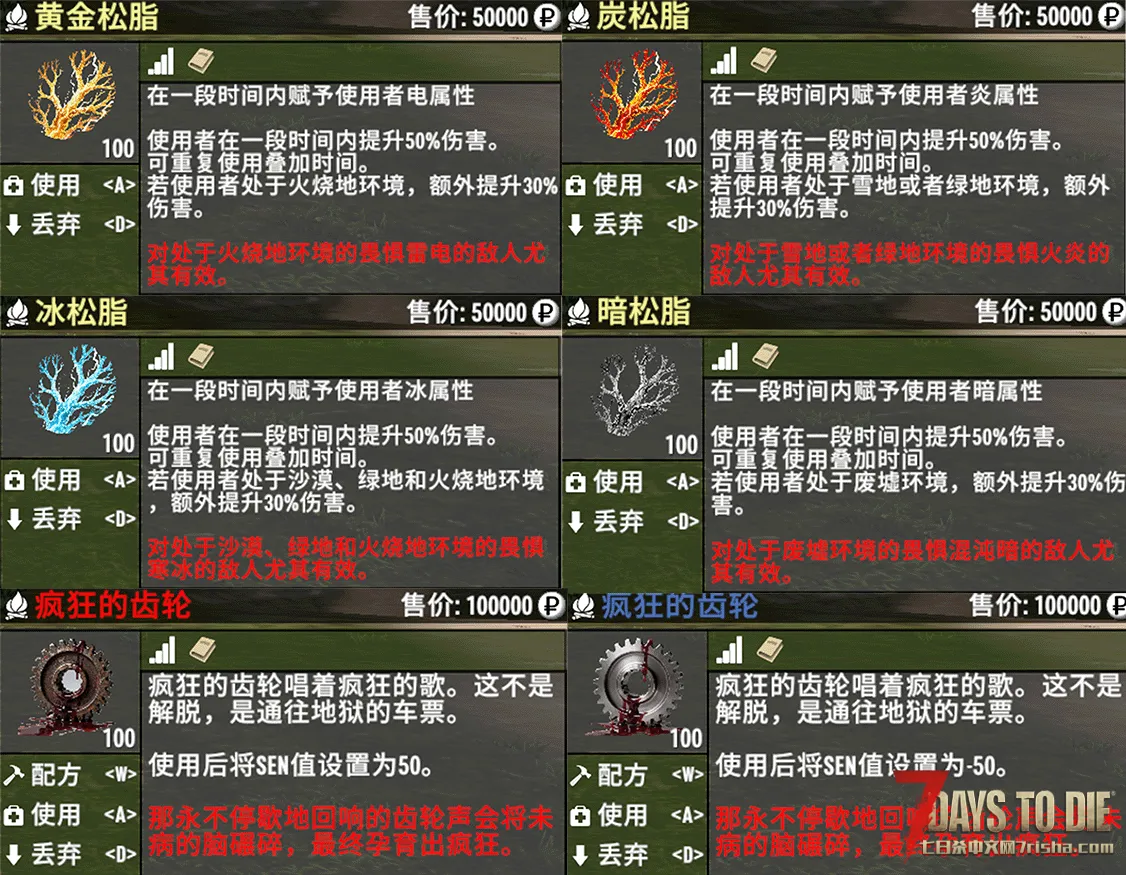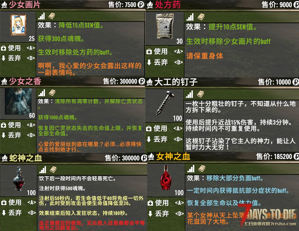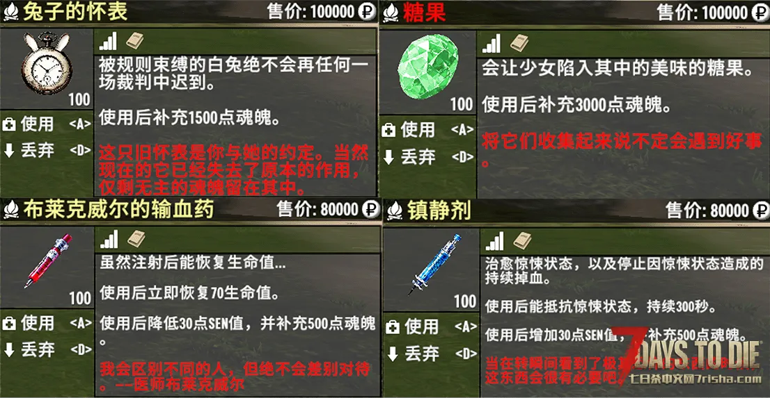 本模组暂时仅提供如下药物、道具,可在游戏内随时调整各种状态。