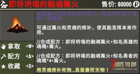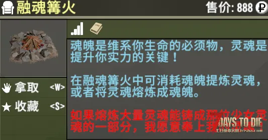 在搜刮时,若您能有机会获取【即将坍塌的融魂篝火】,您可以使用强大的灵魂进行修补。修补成【融魂篝火】后,您将可以在篝火中将灵魂熔炼成魂魄,抑或是将魂魄精炼成灵魂。在制作特定道具【空的融魂瓶】后,将能随时将十枚魂魄或者灵魂灌入融魂瓶中批量使用。