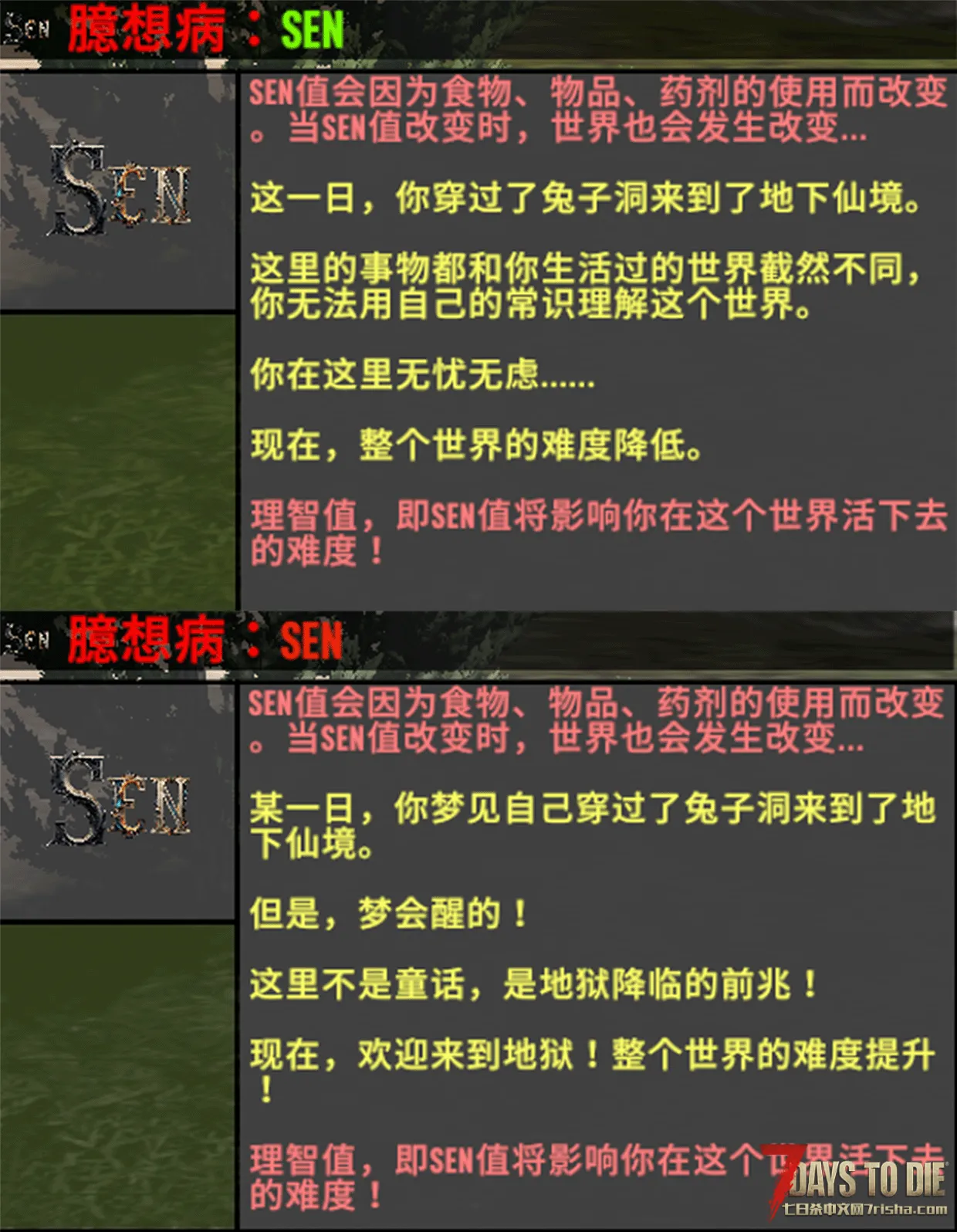 【臆想症】是由阳向渚开发的一款几乎可以兼容任何模组的大型模组。目前发布为测试版本,仅包含基础的游戏玩法和关键道具。该模组可通过游戏内的物品进行动态的游戏难度和游戏阶段的调整。本模组将SEN值设为主要的游戏玩法,可通过游戏内使用特定道具增减SEN值来达到对游戏难度的动态调整。SEN值会影响你的游戏阶段和游戏难度。你可以通过游戏内道具进行动态调整。另一个重要玩法是魂魄计数,该计数是你能存活的时间,若计数归零则会立即死亡,可通过游戏内道具进行动态调整。在你即将因魂魄计数归零而死亡时将会触发长时间且明显的提示buff,直到你的魂魄计数恢复到一定数量。