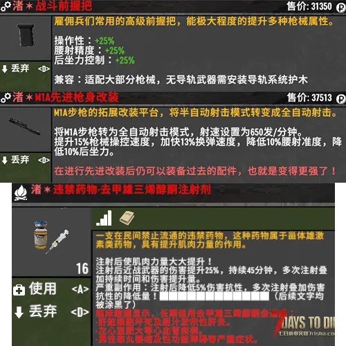 新增药剂【违禁药物·去甲雄三烯醇酮注射剂】注射后近战武器的伤害提升25%,持续45分钟,多次注射叠加持续时间和伤害提升量。严重副作用:注射后降低5%伤害抗性,多次注射叠加伤害抗性的降低量!