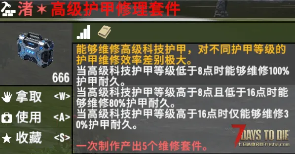 新增物品【护甲修理套件】 (可通过制作获取)可以对高科技护甲进行修补,针对不同护甲的等级的修理量也有所不同。