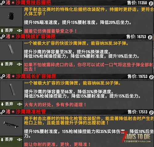 另外,本模组还为部分枪械制作了专属配件(不改变枪械外观),可为这些武器提供各种的属性。目前除了通用护木片可通制作设计图来批量制作。其他模组均只能在所有商人处随机刷新出来。