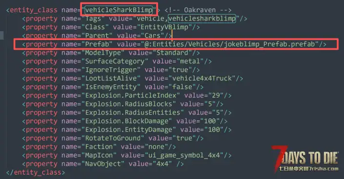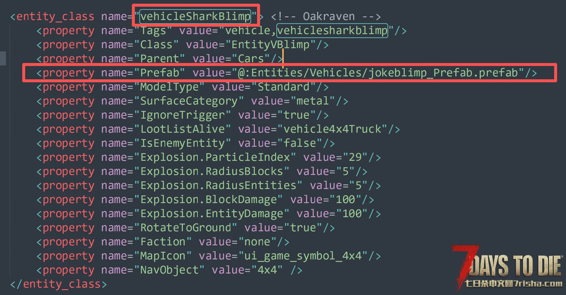 把Config/entityclasses.xml里面vehicleSharkBlimp下的Prefab那行改成<property name="Prefab" value="@:Entities/Vehicles/jokeblimp_Prefab.prefab"/>