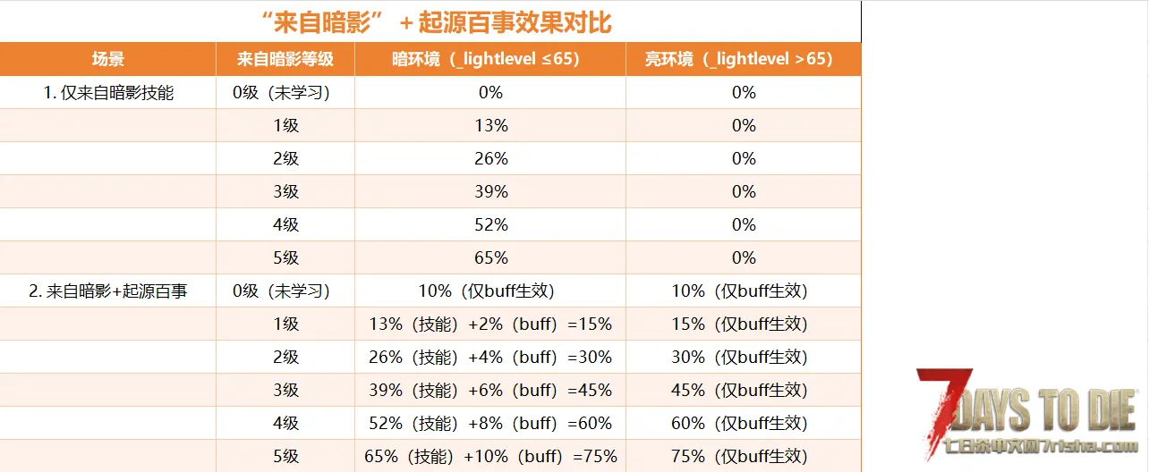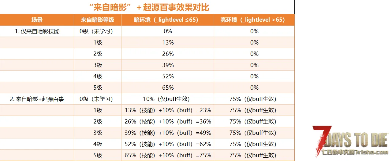 由于上一个版本的起源百事在游戏初期,环境光照大于65时就能获得高达75%的丧尸可见性(LightMultiplier,官方翻译为“躲在阴影里的效率”)降低,而此时由于玩家还没有点“来自暗影”技能,导致前期玩家在高亮环境下潜行效率比昏暗环境下还高上数倍,要到玩家点满“来自暗影”技能时,高亮和昏暗环境的潜行效率才趋于持平,这是不合理的。该版本加成列表如下: