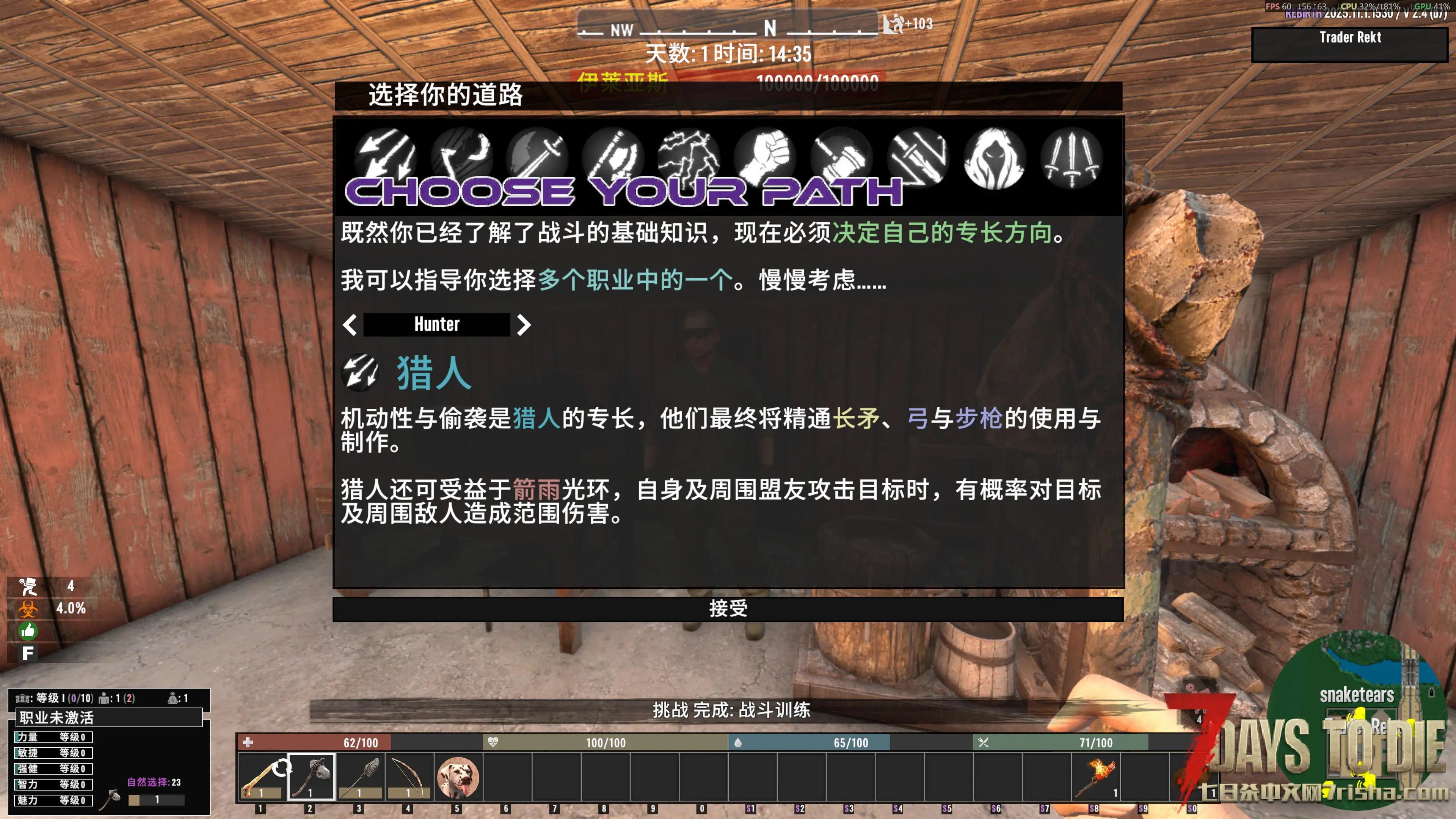 大猫个人比较推荐的新手职业是猎人,潜行射箭的。箭矢可以通过塑料+小石子大量产出(最好在工具箱制作,产出翻倍),塑料满世界都是,基本可以算是无限弹药。而且射箭对体力基本没有要求,而且减少了感染/辐射/中毒的风险,职业技能弓箭1级之后,会增加50%的换弹速度,并且每升1级都增加50%,木弓的射击手感骤然起飞,你就是末世的大盗罗宾汉!