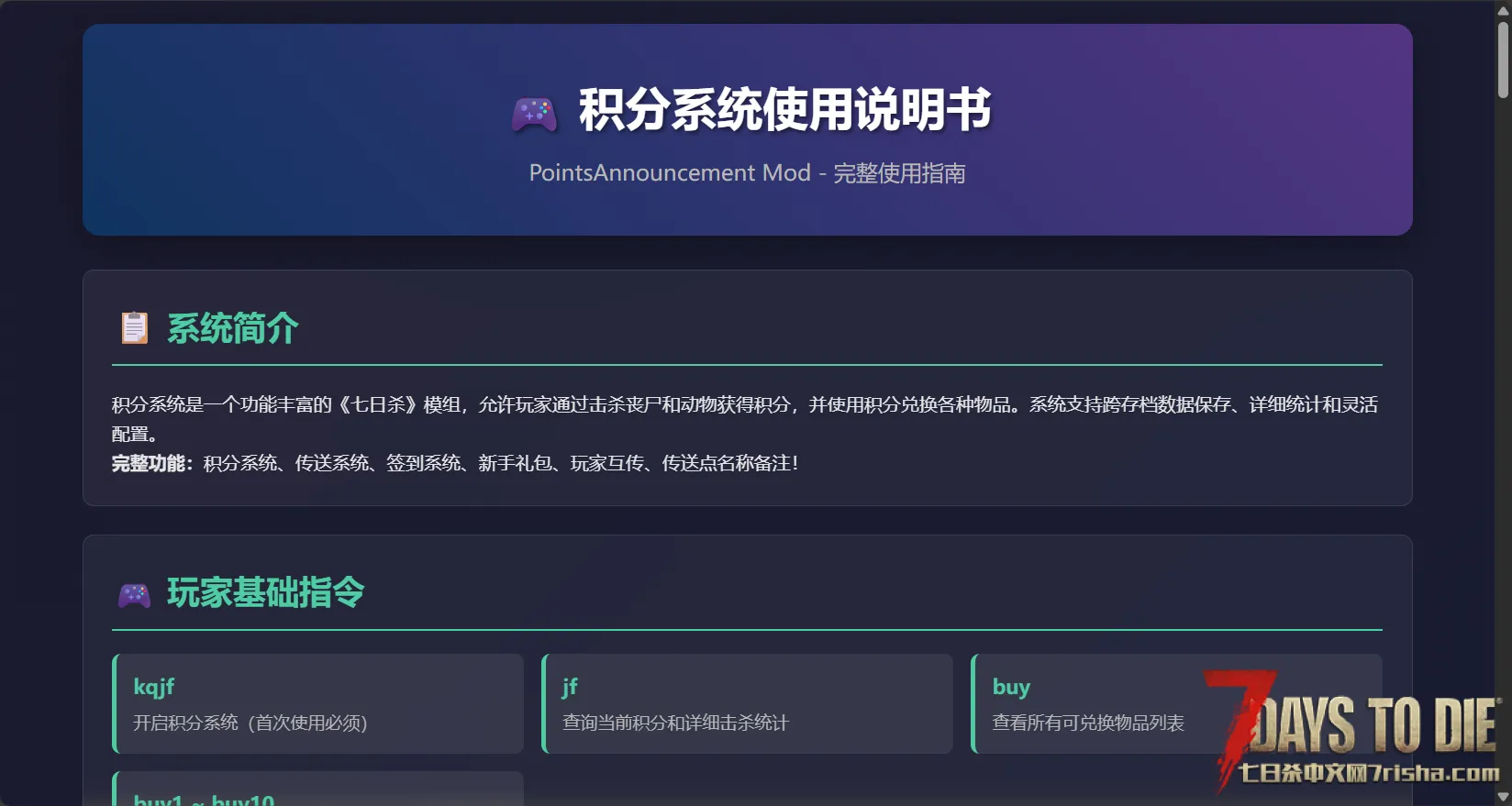 积分系统是一个功能丰富的《七日杀》模组,允许玩家通过击杀丧尸和动物获得积分,并使用积分兑换各种物品。系统支持跨存档数据保存、详细统计和灵活配置。