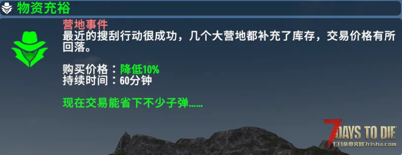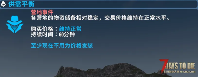 欢迎使用 “动态市场事件”模组!这个模组为《七日杀》的贸易系统注入了真实的末日经济波动。每隔一段时间,游戏中的交易价格会根据随机事件发生变化——从物资过剩导致的降价,到感染者暴动引发的物价飞涨,每一次交易都充满策略与不确定性。