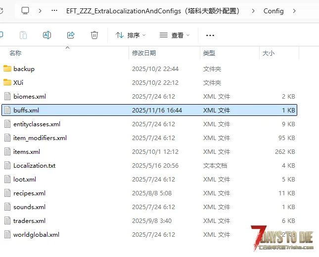 找到:”\SteamLibrary\steamapps\common\7 Days To Die\Mods\EFT_ZZZ_ExtraLocalizationAndConfigs(塔科夫额外配置)\Config”