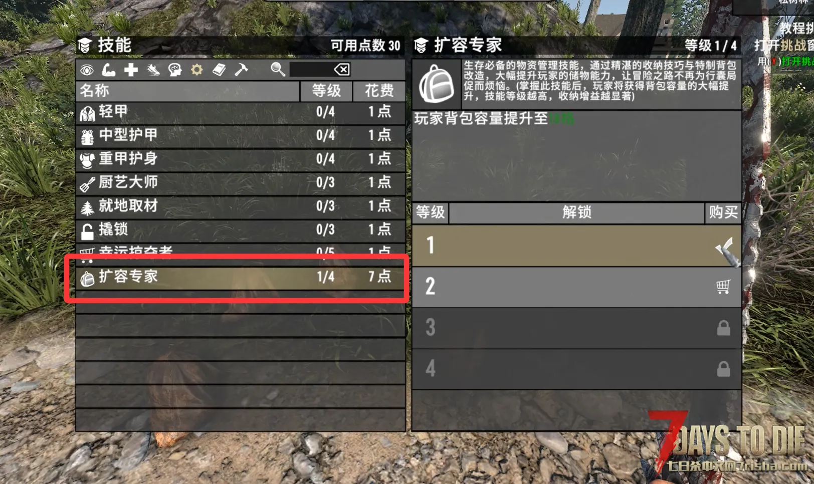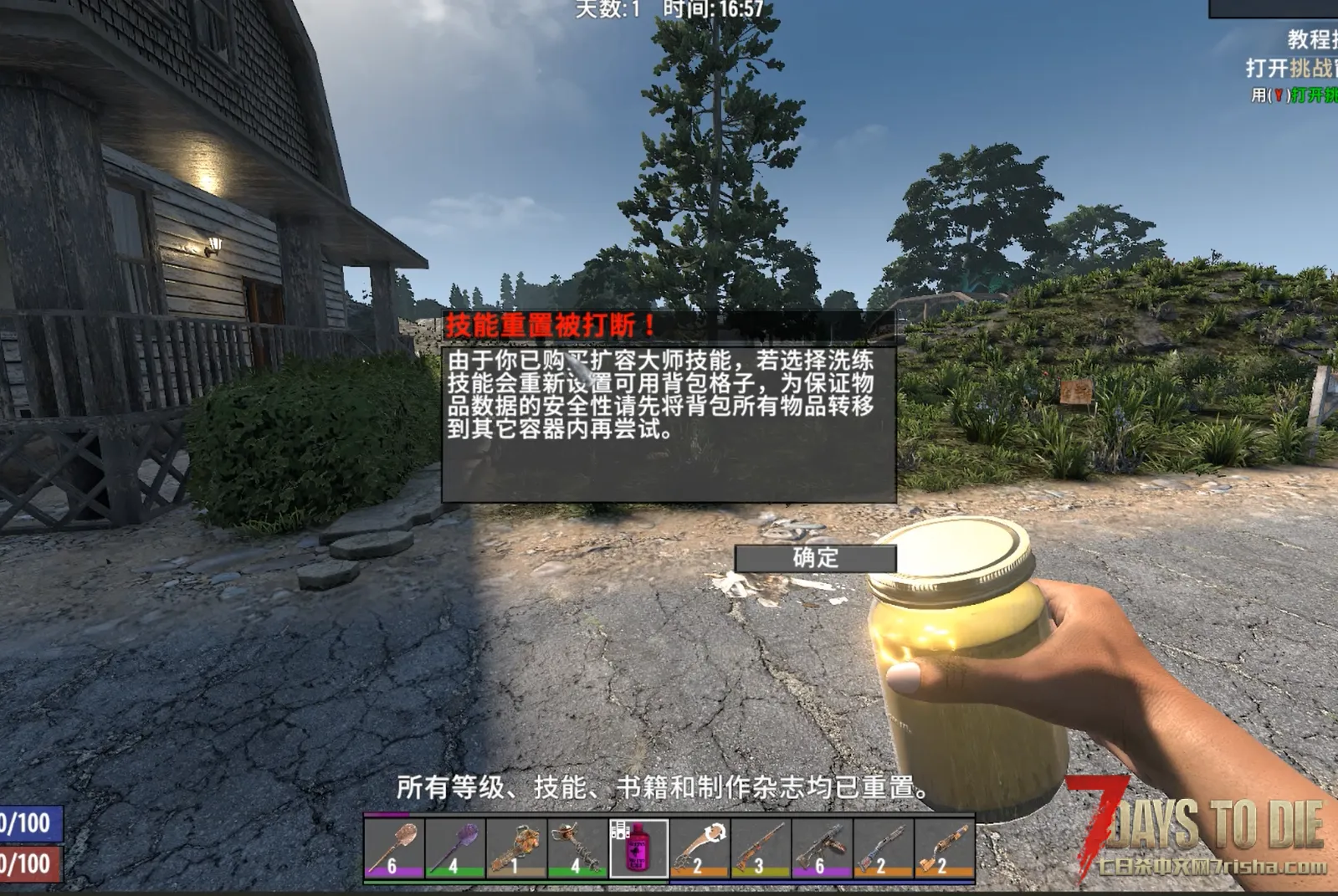 玩家在初始状态默认只有九格背包,装满后必须通过技能点购买”扩容专家“技能来扩充背包格子,如图三购买等级1后又扩充了9个格子,以此类推;此外为了确保Mod数据平衡,因为动态背包所关联的”拓展大师“技能会影响格子数量,所以我在洗练技能前加了一个拦截(如图四)如果背包内存在物品,洗练技能前请先转移到其他容器中以免数据丢失情况发生。