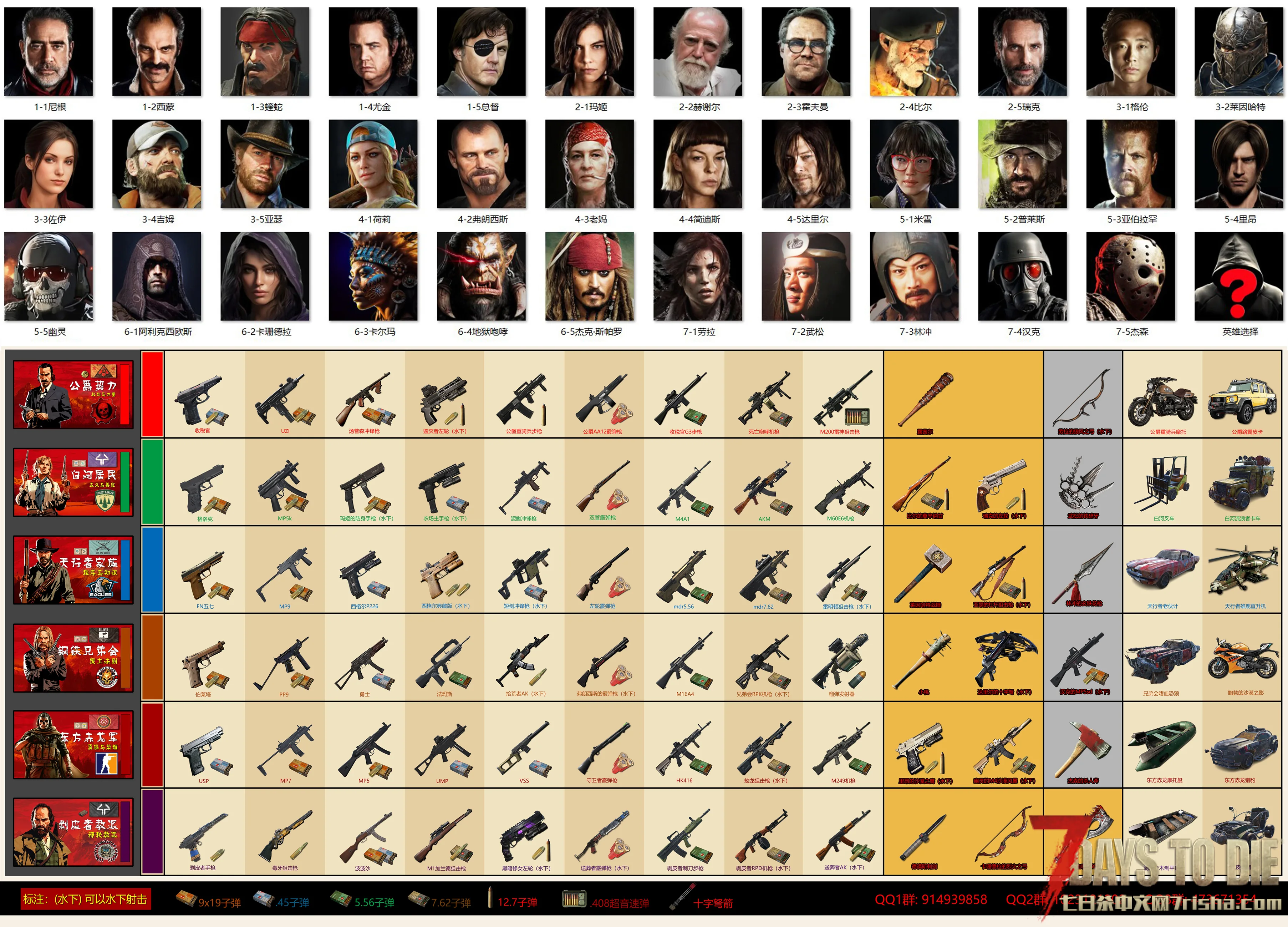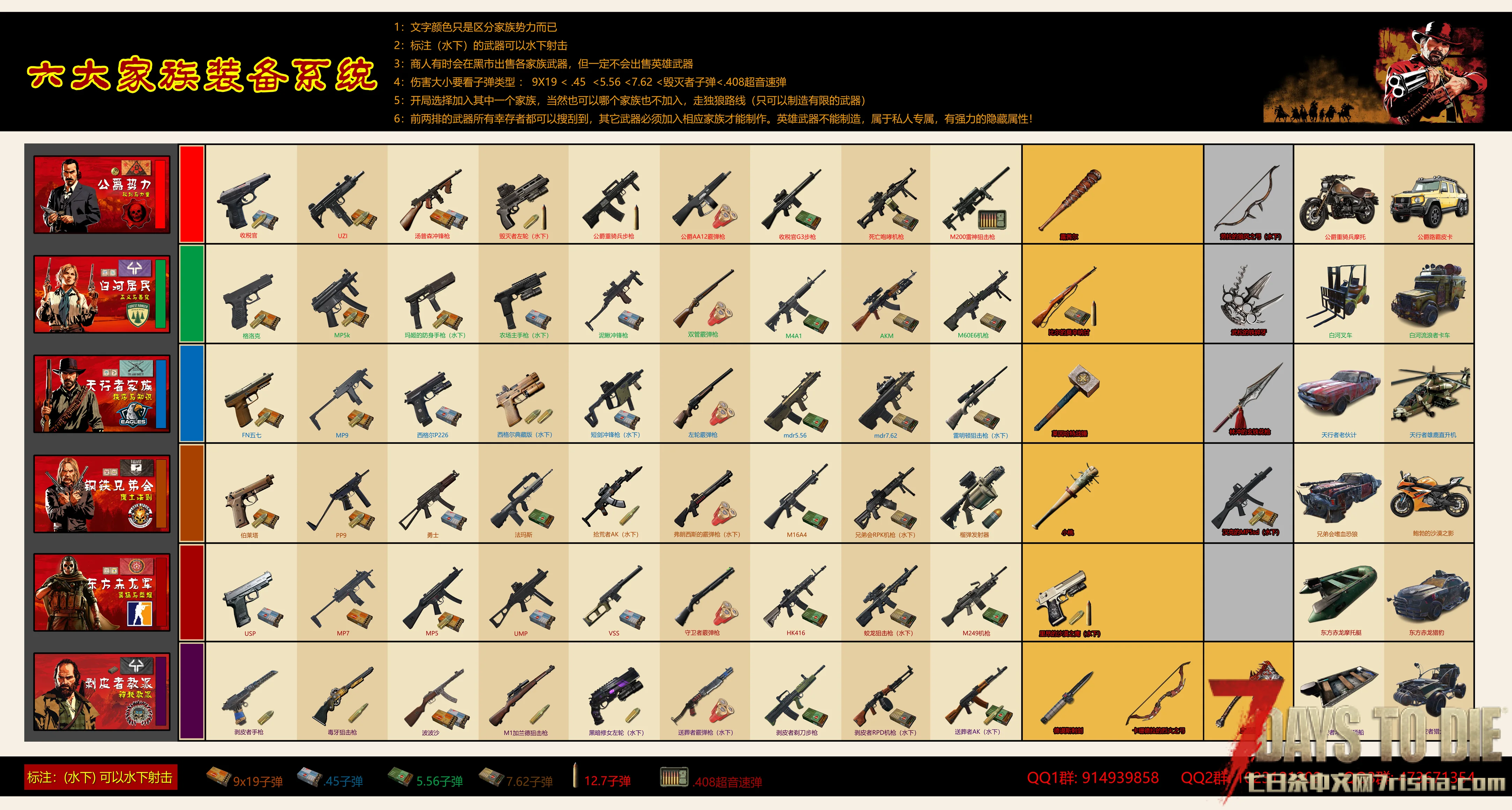 6:前两排的武器所有幸存者都可以搜刮到,其它武器必须加入相应家族才能制作。英雄武器不能制造,属于私人专属,有强力的隐藏属性!