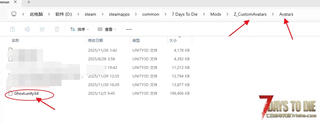 ②将解压包里的Ghost.unity3D文件放到Z_CustomAvatars文件夹的Avatars文件夹内