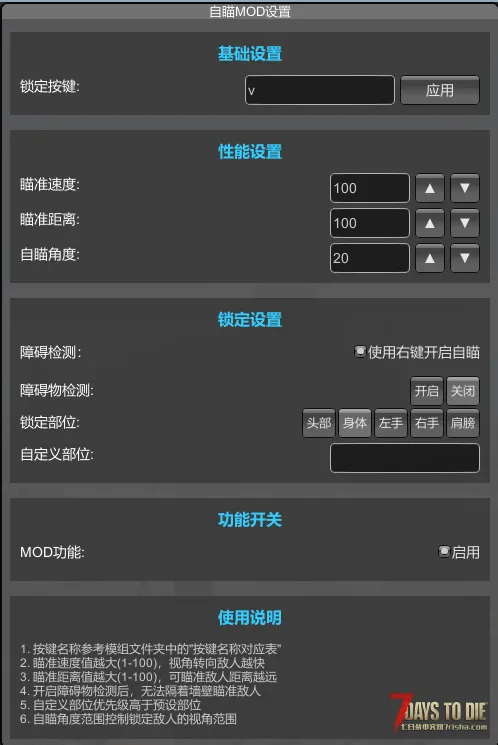 mod介绍【V2.X-1.0】辅助自动瞄准(单机/转载自N网) – 七日杀MOD模组下载 – 七日杀中文网,因为按一下开关太难用了,我将自瞄开启从切换改成了按住开启松开结束,有需要的可以拿。