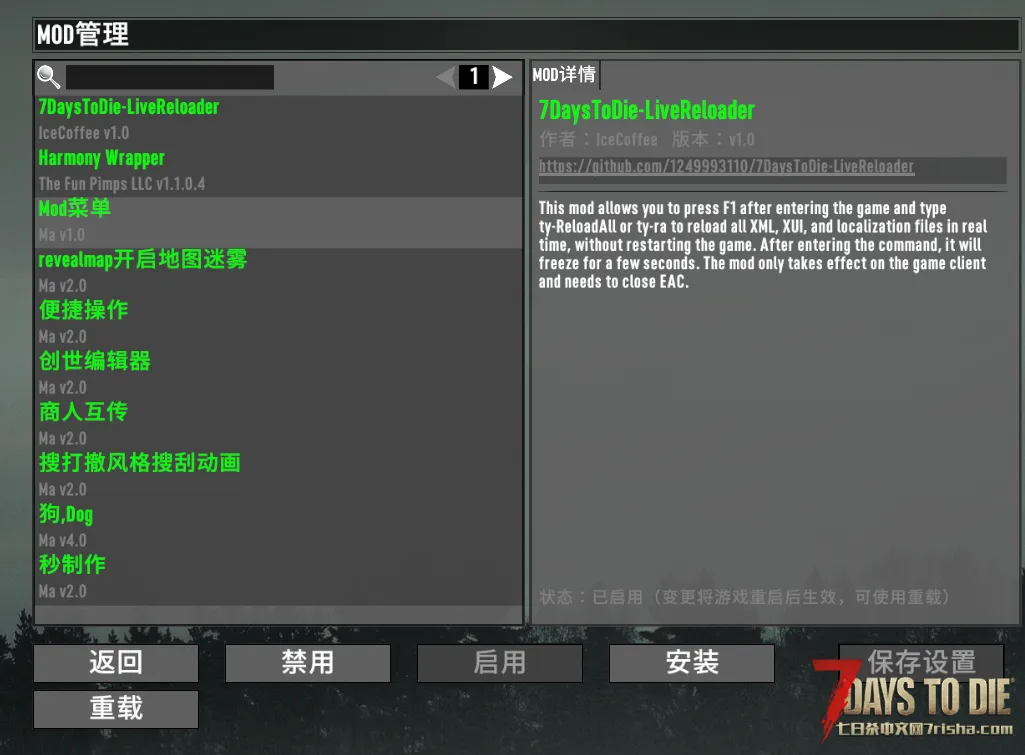 在进行禁用或者启用操作后请手动重启游戏或者可以点击重载按钮