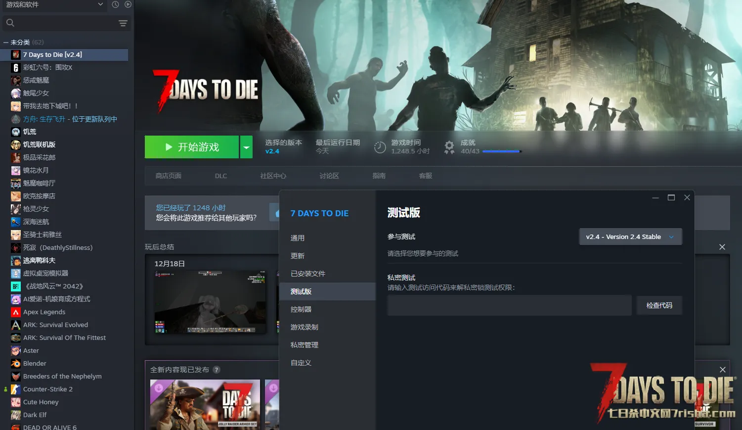 然后在steam页面右键七日杀-属性-测试版,手动选择V2.4版本