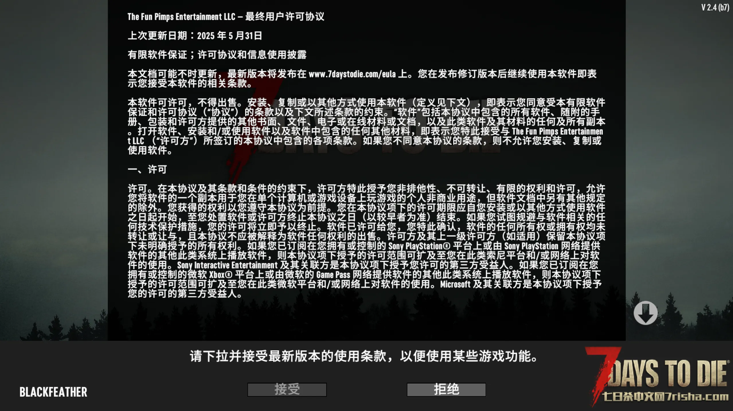 安装完成后,不要添加任何mod,纯原版启动游戏,此时你会看到游戏内弹出用户协议,就跟你第一次下载启动七日杀那样