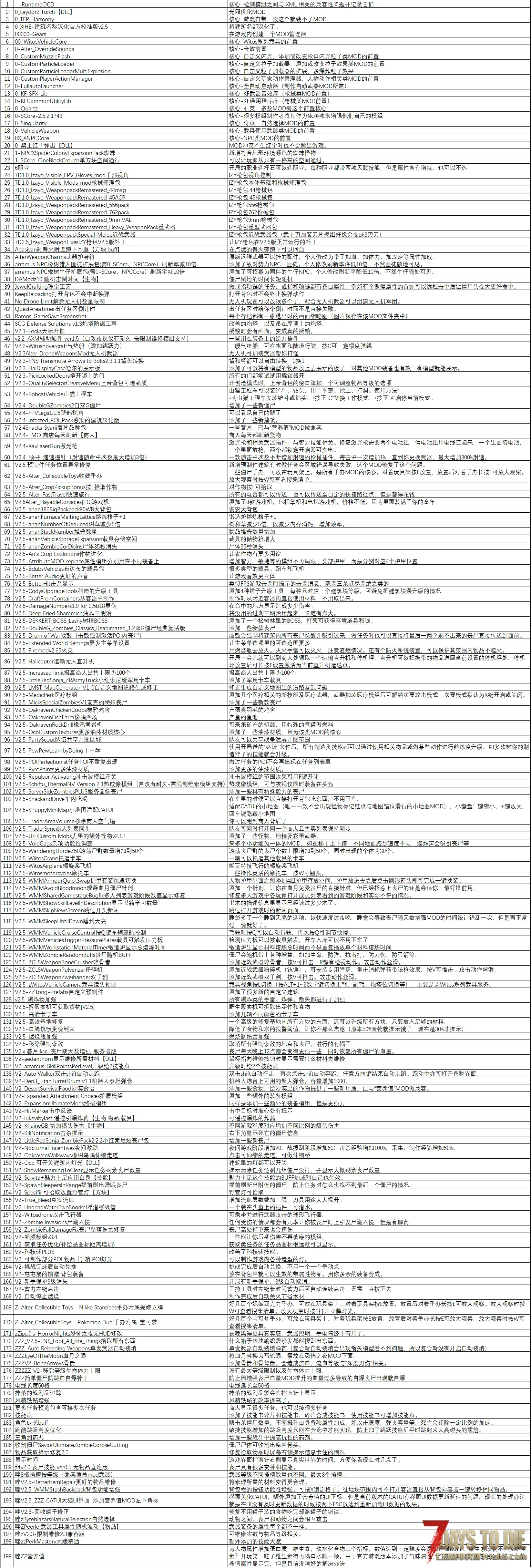 本整合包是在V2.5b23版本游戏测试通过的,初步测试无红字报错,也增加了一些新的好MOD。比如对潜行党利好的消除强制惊醒点,打击丝滑的近战武器,一些新的载具、跑车、直升机,新丧尸,干中学,护甲套装一键切换,快速过夜的睡袋,规避血月丧尸追击的针剂(注意在丧尸已经发现你之后再打针是没用的,这个针剂只能防住暂时没有定位到你的丧尸,已经盯上你的该挠你还挠你,所以最好准备两针,无缝衔接以躲避血月),热成像模组,类似CF的击杀提示,燃烧瓶放火,开车时可以吃食物等各种增加游戏性的MOD。基本就是包挺大,玩起来也没感觉加了啥,但是玩起来更爽更顺畅了,希望各位朋友愉快玩耍。
