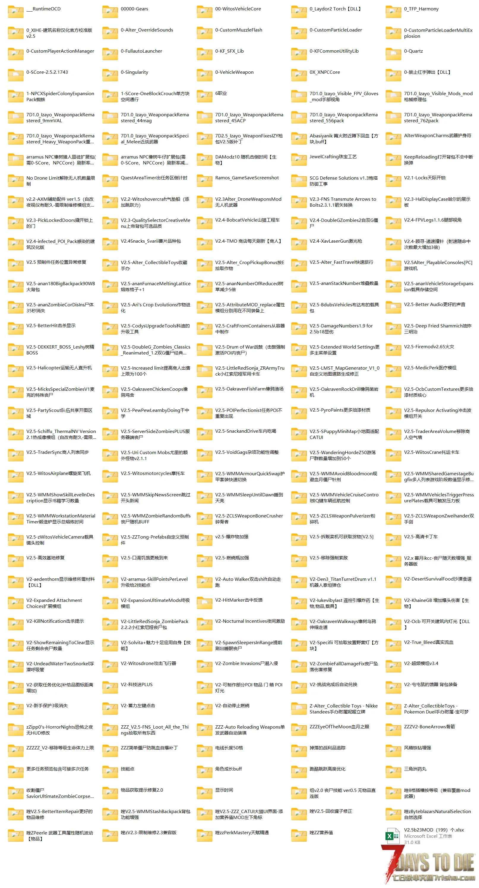 有使用MOD经验的玩家可以从中自取搭配,没经验的玩家就直接用纯净V2.5b23版本游戏本体,然后把这个包整个扔进去就行了。记住装了MOD后开游戏都要把EAC关闭哦,也就是用游戏根目录的7dLauncher打开,将EAC选项的勾去掉即可。