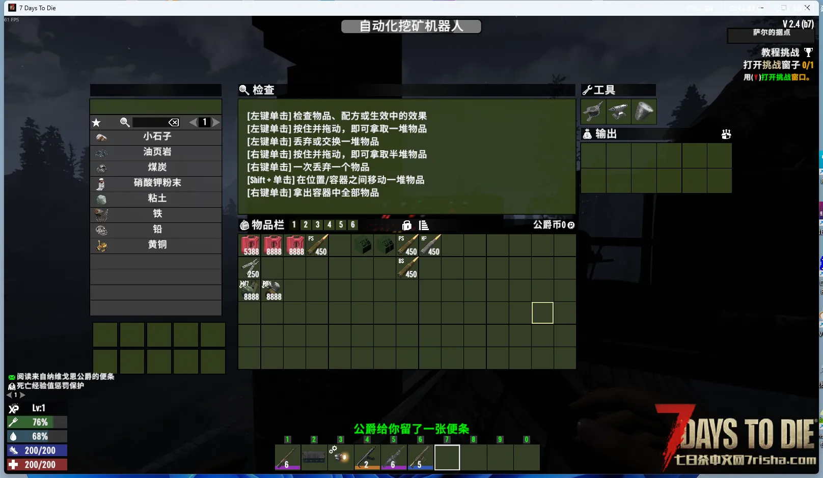 因为自己玩的时候发现,还是需要原版的火药去搓榴弹炮,所以现在新增了采矿机可以挖掘硝酸。