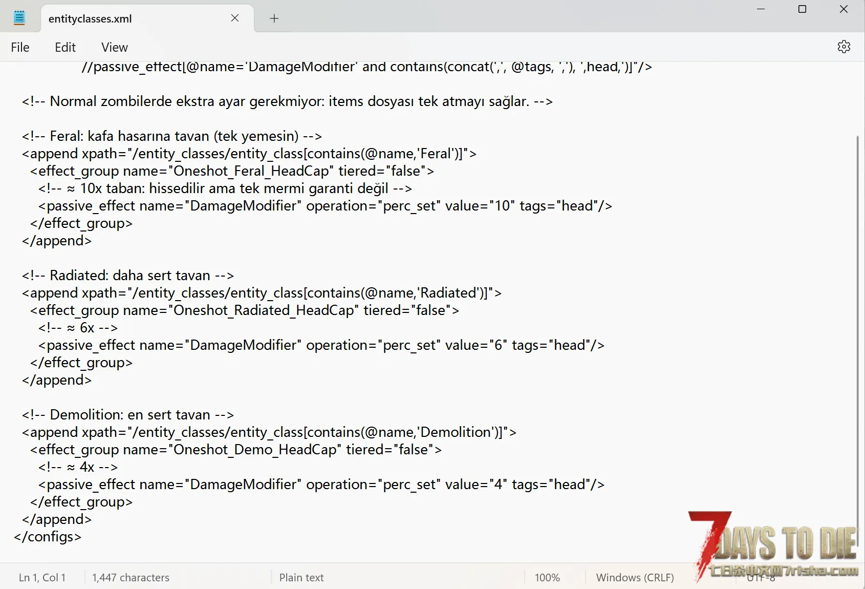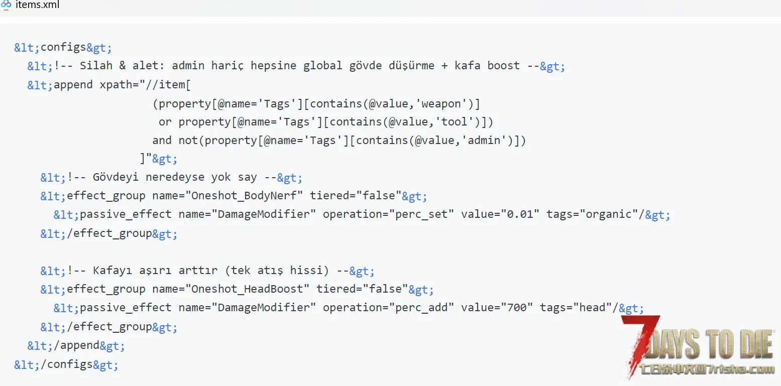 item文件是针对普通丧尸、躯干伤害、工具是否可以造成爆头伤害这三项的修改,如果想取消躯干弱化,只需要将第二大段删除就好,如果想取消工具的爆头伤害,也是修改相应的代码,还请自行研究。