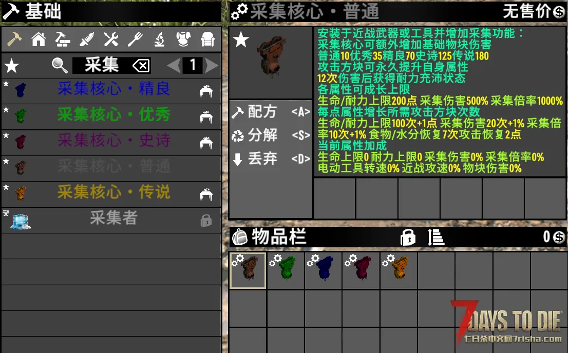 1:可安装于所有近战武器/工具并添加采集功能(装在砍刀上那砍刀就有采集功能)