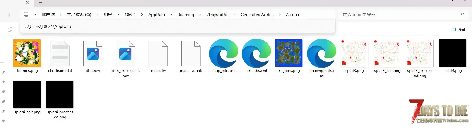 C:\Users\USER_NAME\AppData\Roaming\7DaysToDie\GeneratedWorlds\Astoria\(地图文件在此)