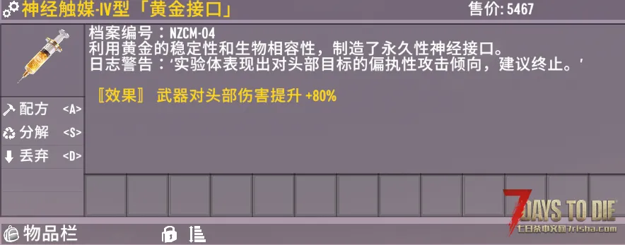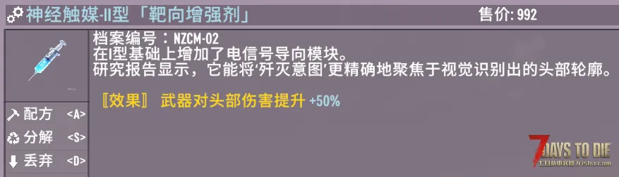 模组名称 NeuroCatalystAttachments(神经触媒爆头强化) 适配版本 七日杀 V2.5 (b32) Stable