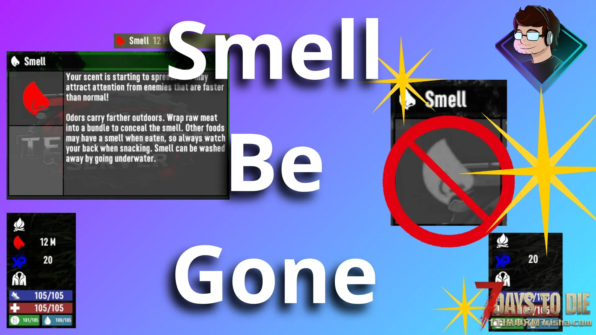 可完全禁用气味机制。该模组每秒将气味相关变量强制设置为0,自动移除与气味相关的增益效果、图标及音效。僵尸和动物(如狗、野猪、狂兽等)会完全忽略气味,从而避免因生肉而聚集的怪物群。该模组对服务器和客户端均安全且体积小巧。