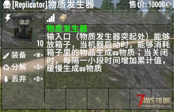 “物质发生器”可在工作台使用100个锻钢制作而成,其产出的“UU物质”是整个模组的核心材料。初始状态下,“物质发生器”具备两种工作模式:开启时可消耗10,000个任意物品,合成出1份“UU物质”;关闭时则无需任何消耗,仅需30分钟即可自动产出1份“UU物质”。
