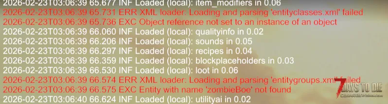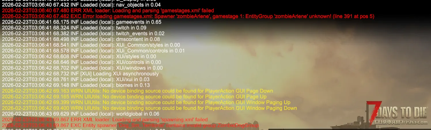大概率可能是有MOD添加的内容格式错误了,没有正确闭合,导致其修改后的原版的xml内容失效,再读其他xml时找不到对应的name。看样子像是entityclasses.xml先出错,很大可能是丧尸包或NPC包出错了。