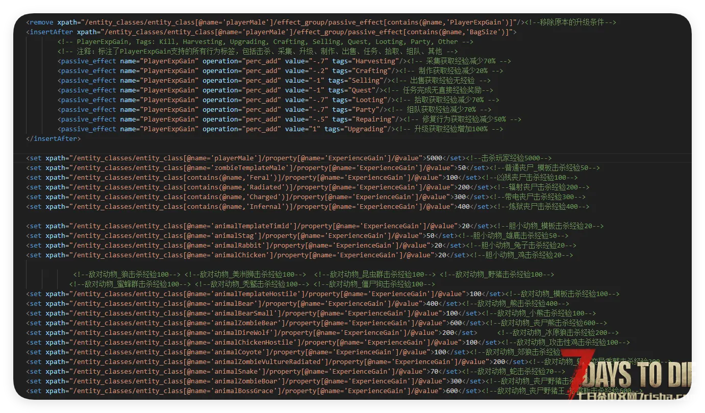 下面这段内容,是对玩家升级,以及几乎所有丧尸、动物、击杀获得经验做改动的内容,需要的朋友可以改成更难或更容易的