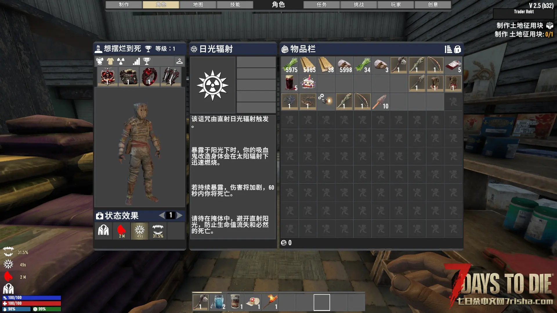 直射阳光会灼烧你的身体。暴露60秒后,除非你能找到避难所,否则死亡是不可避免的。