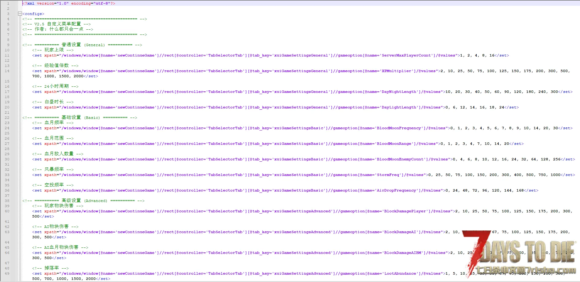 如果有需要可以自行打开Config/XUi_Menu/windows.xml文件进行修改,我已经将每一项都做了注释