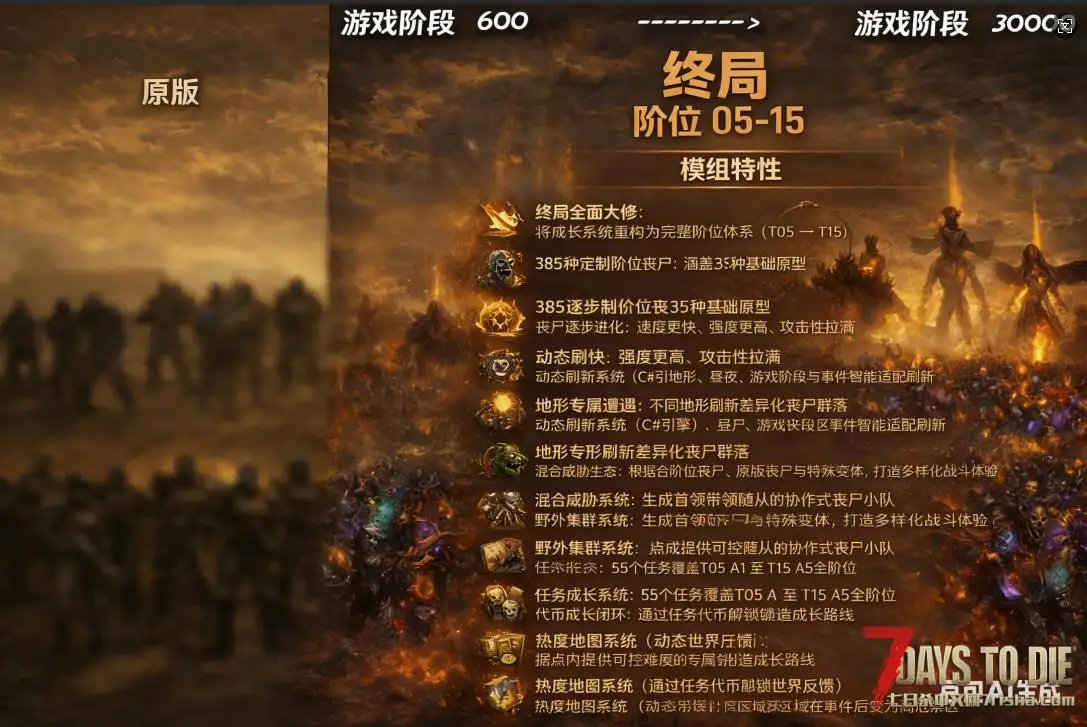 AEC 终局大修并非简单的内容扩充模组。它彻底重构了游戏的成长、难度、遭遇事件的演化逻辑。当游戏阶段达到 600 级后,游戏将进入全新联动体系:丧尸按固定阶位进化刷新机制具备动态环境感知任务决定难度与成长进度装备遵循统一缩放规则世界会对你的行动做出反馈