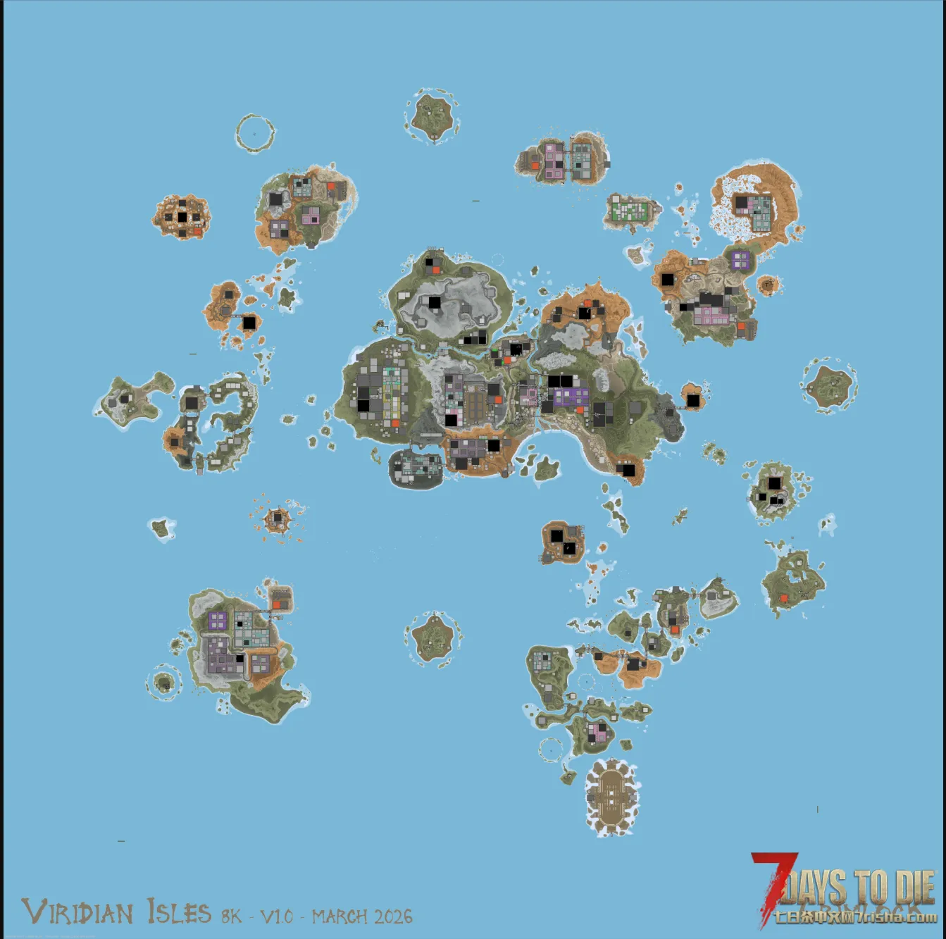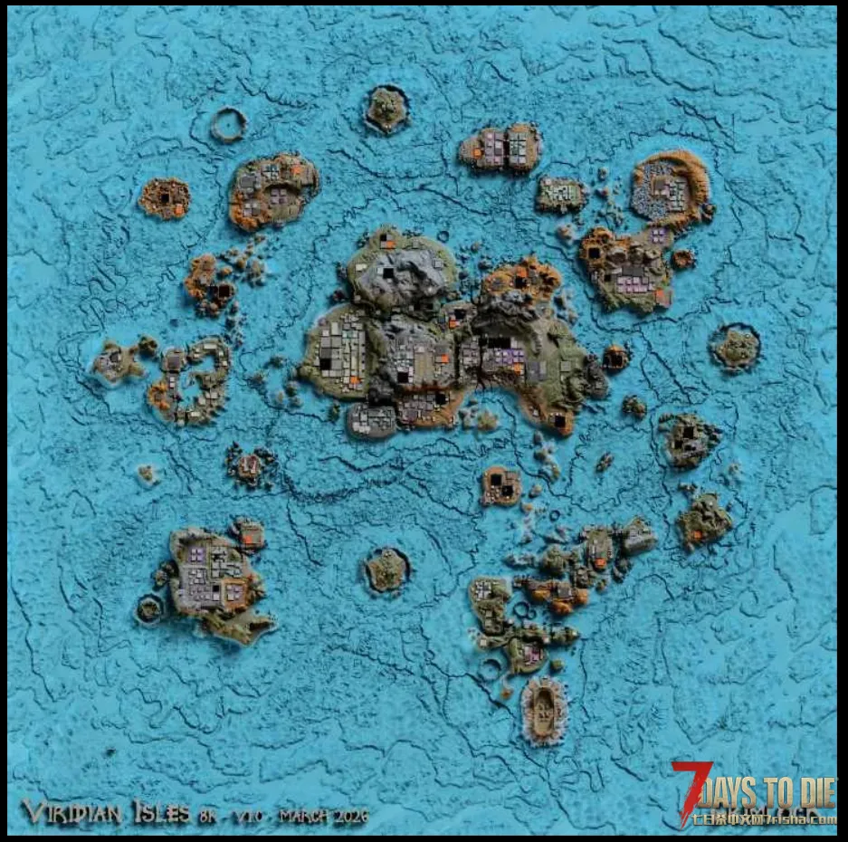 这张地图围绕一个主岛屿和卫星岛展开。主岛应被视为一个大城市,区块由地形分隔。卫星岛屿提供中后期的游戏体验。许多岛屿都有主题和丰富的细节以支持这一主题。地图上也有挑战地点。如果球员未达到面对他们的水平,应始终考虑逃跑。一定要去看看所有卫星岛,其中一些甚至超出了你在《7天生》地图中能找到的极限!