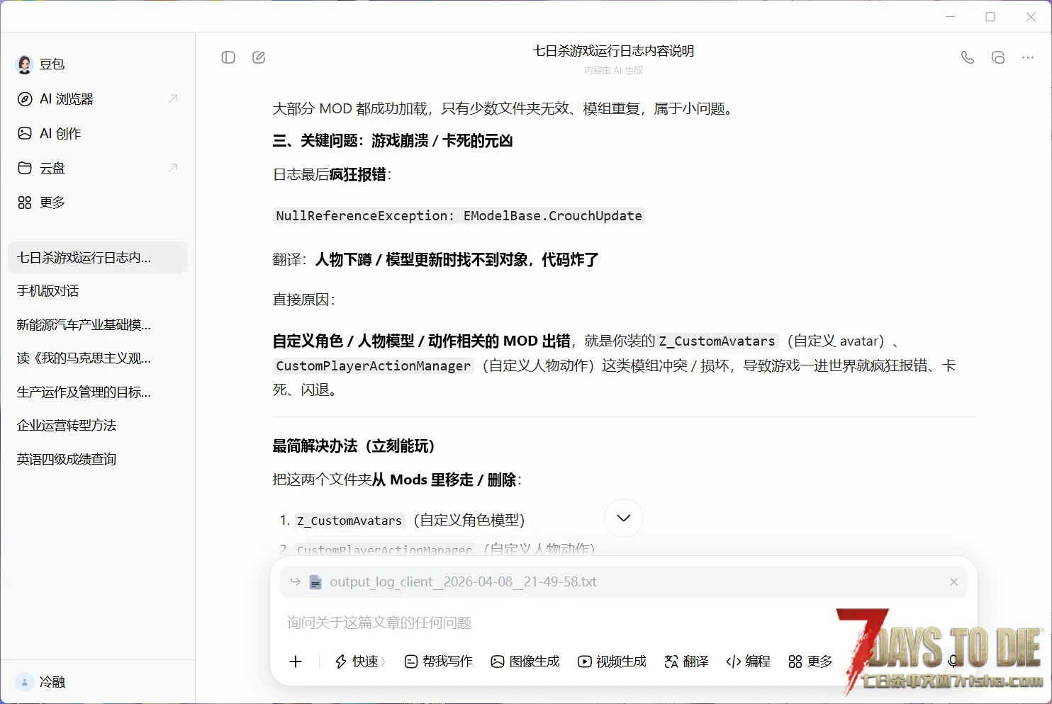 猜测是塔可夫的人物动作与下面这个模组冲突了,但是俩个分别删了也进不去存档,不过第二个删了进游戏界面是没有出现报错的,俩个不删进游戏的标题界面也没有报错,一进存档就崩溃,群友一开始认为是kfcommonutilitylib有问题(通用工具库),把我的更换了也没用,我新开一个存档也是正常的,但是不知道我这个存档还能不能补救以及未来新档会不会出现同样的问题,本人也是小白不会,来求助了喵